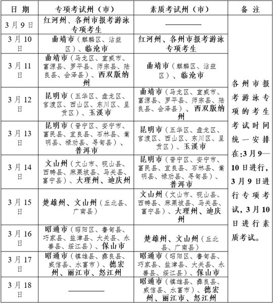 2026年3月9—18日(共10天),各州市具体日程安排详见下表。其中,全省各州市报考游泳专项的考生考试时间统一安排在3月9—10日进行,3月9日进行专项考试,3月10日进行素质考试。如遇不可抗拒因素考试无法正常进行时,考试时间依次顺延。