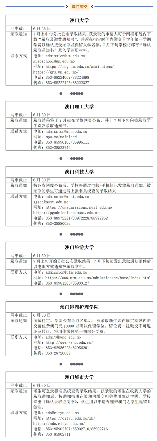 其余13所香港高校和6所澳门高校在我省采用独立的招生方式。考生按照高校的要求提交入学申请,须参加当年高考及高校组织的面试等。高校根据考生高考成绩和面试表现等其他要求录取考生。