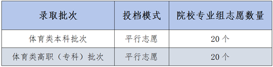 体育类本科批次实行平行志愿,设置20个院校专业组志愿。