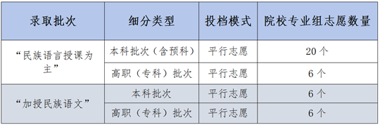 “民族语言授课为主”本科批次(含预科)实行平行志愿,设置20个院校专业组志愿;高职(专科)批次实行平行志愿,设置6个院校专业组志愿。