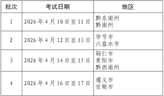 2026年4月10日至17日在贵州师范大学东校区(大学城)组织考试,具体分组如下: