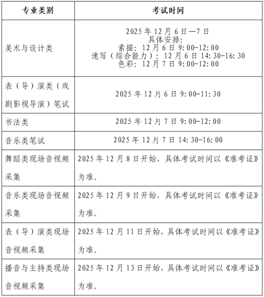 (2)艺术类专业省级统考笔试科目安排在2025年12月6日至7日进行,现场音视频采集科目于2025年12月8日开始。具体安排如下表: