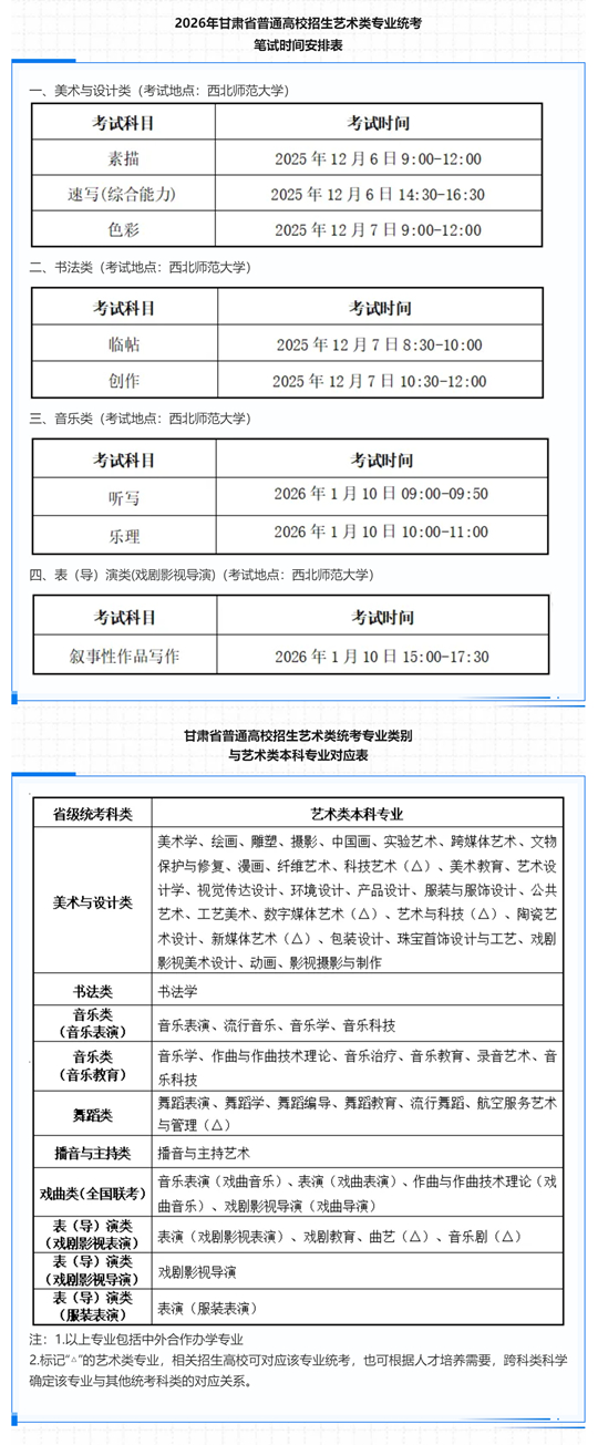 根据《教育部办公厅关于做好2026年普通高等学校部分特殊类型招生工作的通知》(教学厅〔2025〕7号)和《甘肃省高等学校招生委员会关于印发<甘肃省关于进一步加强和改进普通高等学校招生艺术类专业考试招生工作的实施方案>的通知》(甘招委发〔2023〕3号)精神和要求,结合我省实际,现就做好2026年甘肃省普通高等学校艺术类专业考试及招生工作有关事项通知如下: