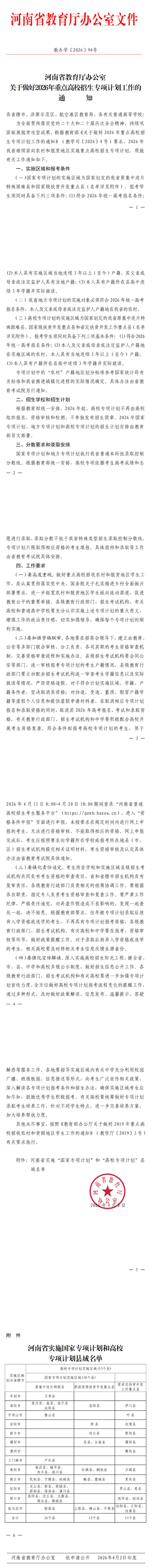河南省教育厅办公室关于做好2026年重点高校招生专项计划工作的通知