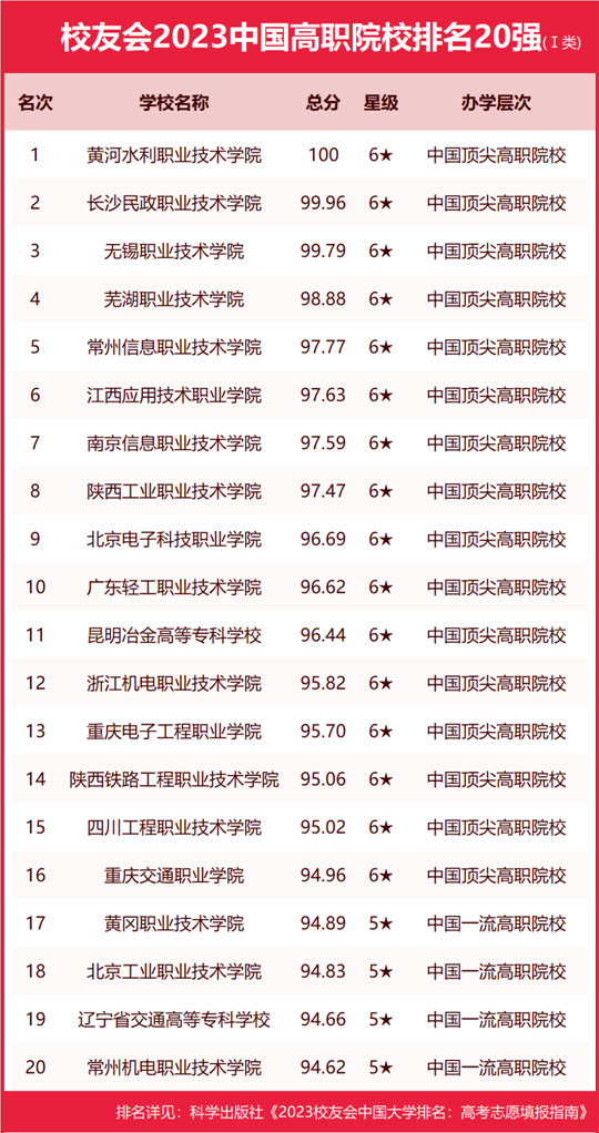 榜单显示,在最新校友会2023中国高职院校排名中,黄河水利职业技术学院、长沙民政职业技术学院、无锡职业技术学院、芜湖职业技术学院、常州信息职业技术学院、江西应用技术职业学院、南京信息职业技术学院、陕西工业职业技术学院、北京电子科技职业学院、广东轻工职业技术学院雄居校友会2023中国高职院校排名I类10强。
