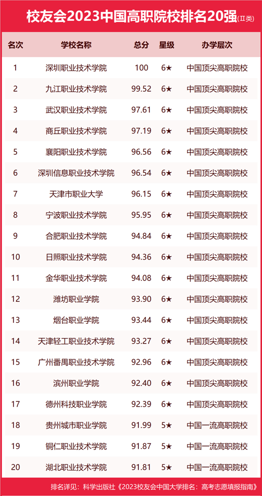 深圳职业技术学院、九江职业技术学院、武汉职业技术学院、商丘职业技术学院、襄阳职业技术学院、深圳信息职业技术学院、天津市职业大学、宁波职业技术学院、合肥职业技术学院、日照职业技术学院位列校友会2023中国高职院校排名Ⅱ类10强。