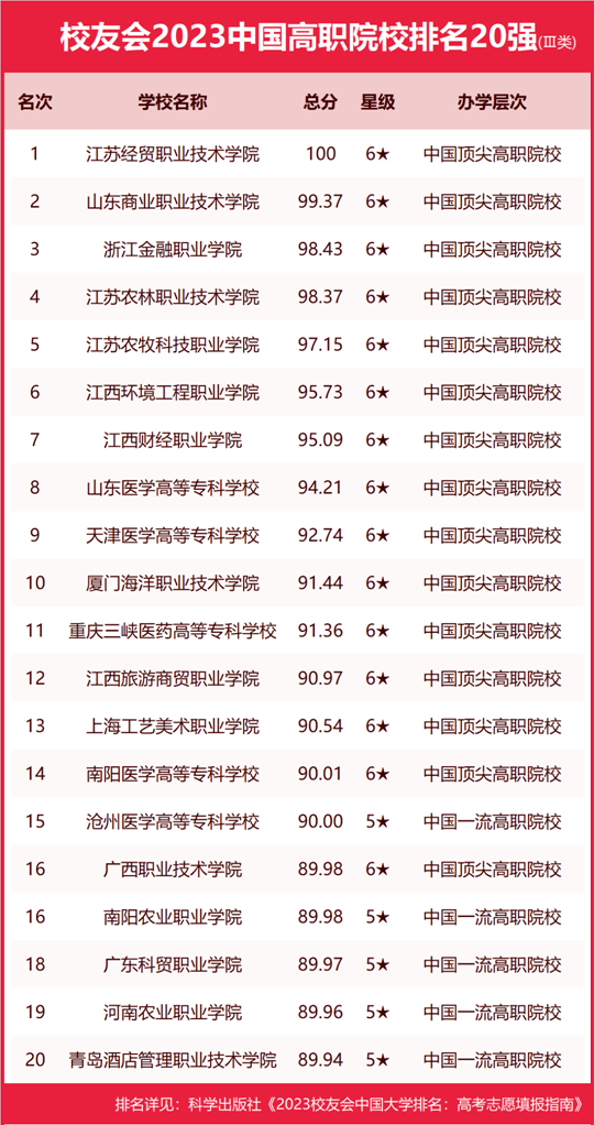 江苏经贸职业技术学院、山东商业职业技术学院、浙江金融职业学院、江苏农林职业技术学院、江苏农牧科技职业学院、江西环境工程职业学院、江西财经职业学院、山东医学高等专科学校、天津医学高等专科学校、厦门海洋职业技术学院名列校友会2023中国高职院校排名Ⅲ类10强。