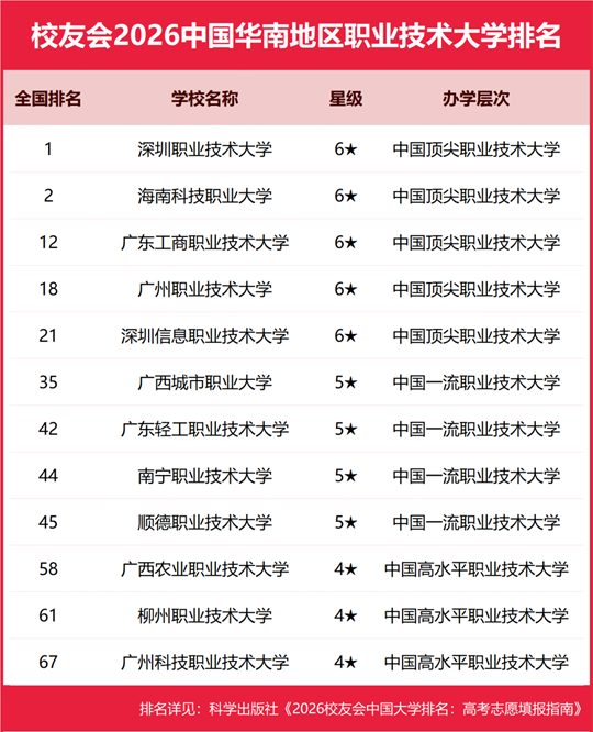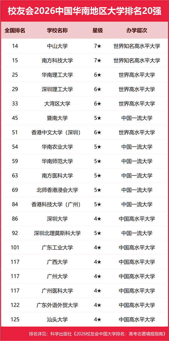 | 校友会2026中国华南地区大学排名,中山大学、三亚学院、广州南方学院、深圳职业技术大学、广东科贸职业学院第一 |