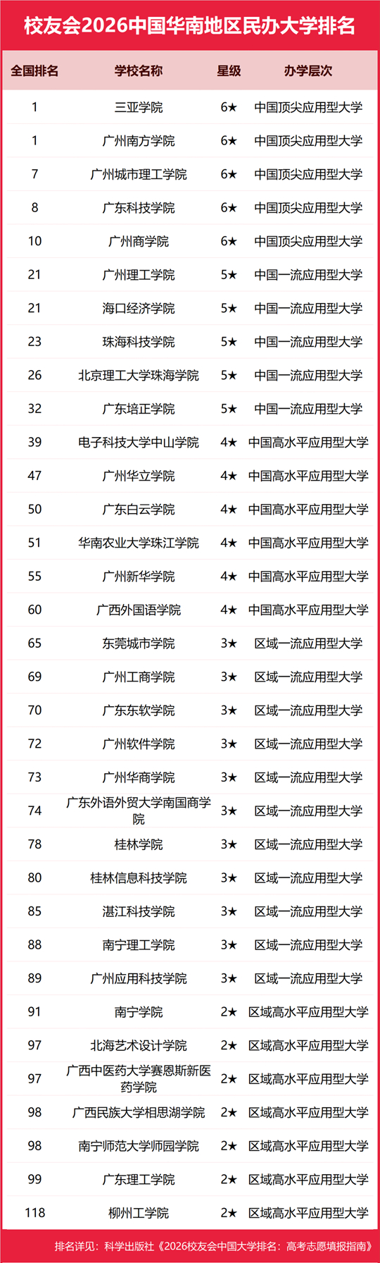 在校友会2026中国民办大学排名中,三亚学院、广州南方学院全国排名第1名,雄居2026中国华南地区民办大学排名第一。广州城市理工学院居第3。名列前10强的其他民办高校为广东科技学院、广州商学院、广州理工学院、海口经济学院、珠海科技学院、北京理工大学珠海学院、广东培正学院。