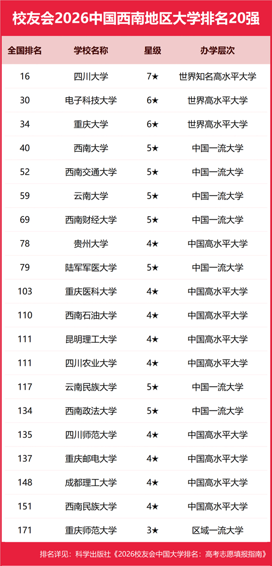 在最新校友会2026中国大学排名中,四川大学全国排名第16名,雄居2026中国西南地区大学排名第一。电子科技大学第2,重庆大学第3。名列前10强的其他高校为西南大学、西南交通大学、云南大学、西南财经大学、贵州大学、陆军军医大学、重庆医科大学。