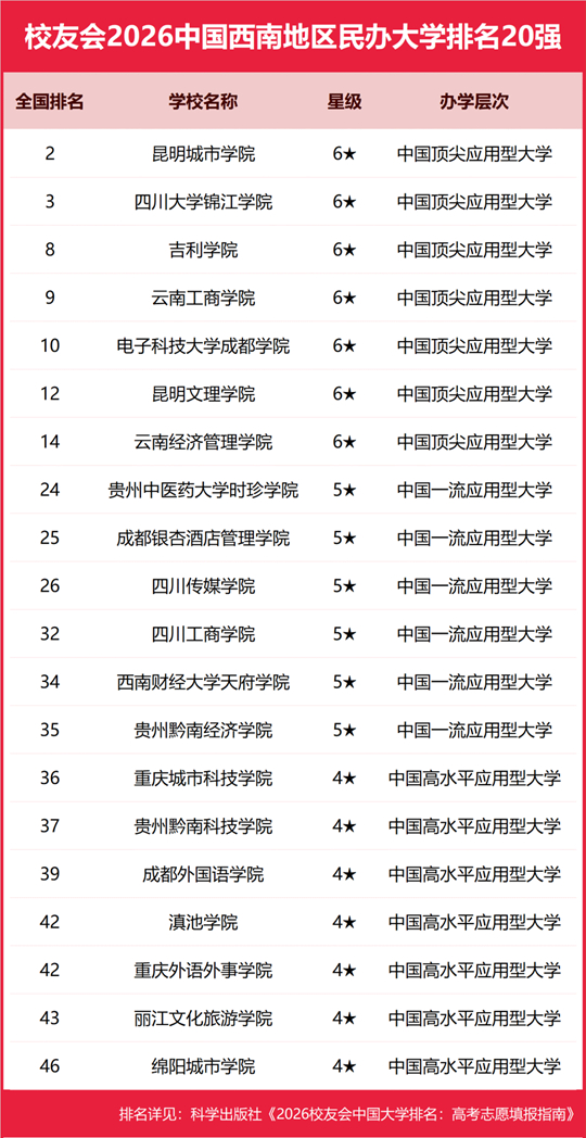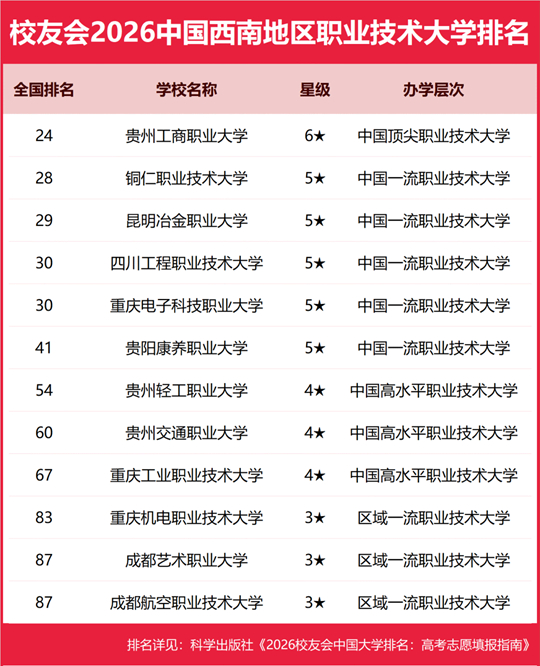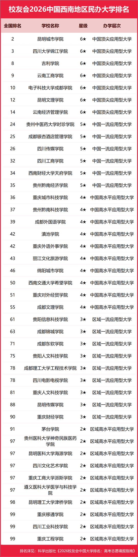 | 校友会2026中国西南地区大学排名,四川大学、昆明城市学院、贵州工商职业大学、四川交通职业技术学院、重庆工商职业学院第一 |