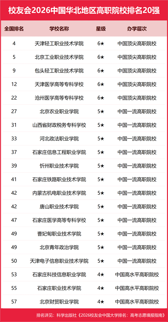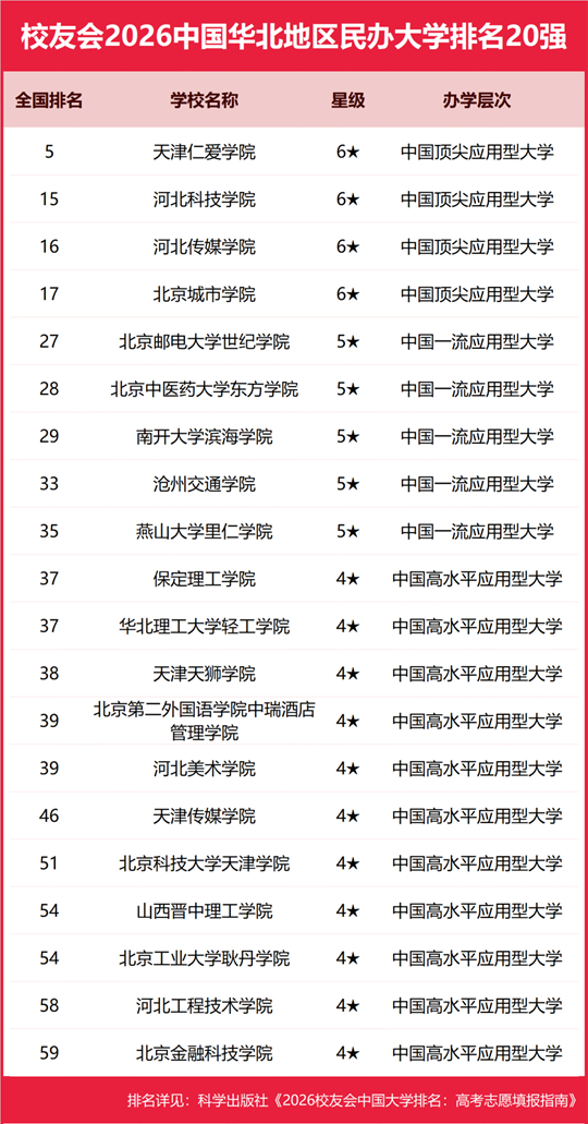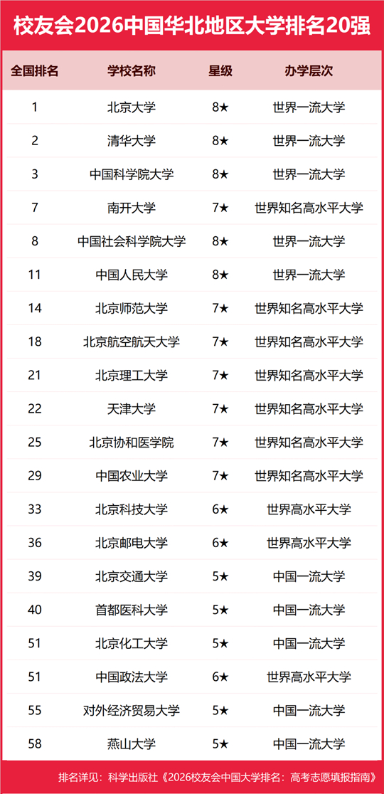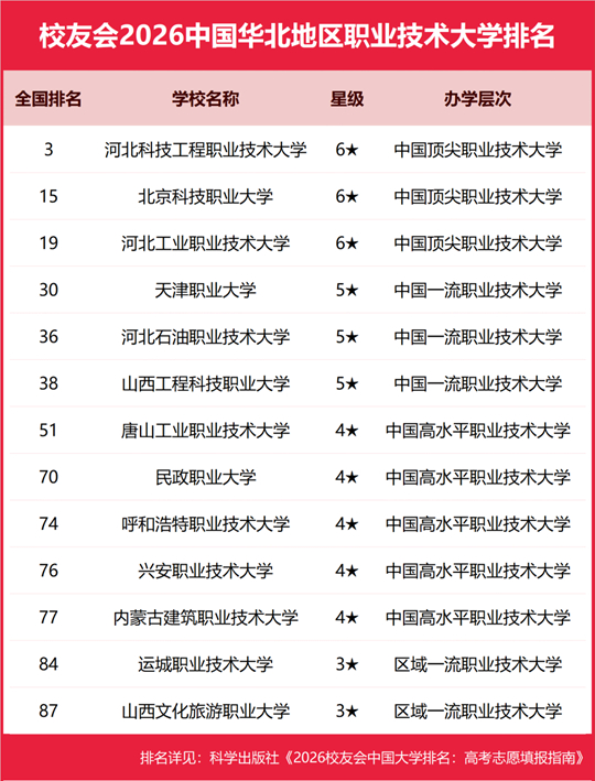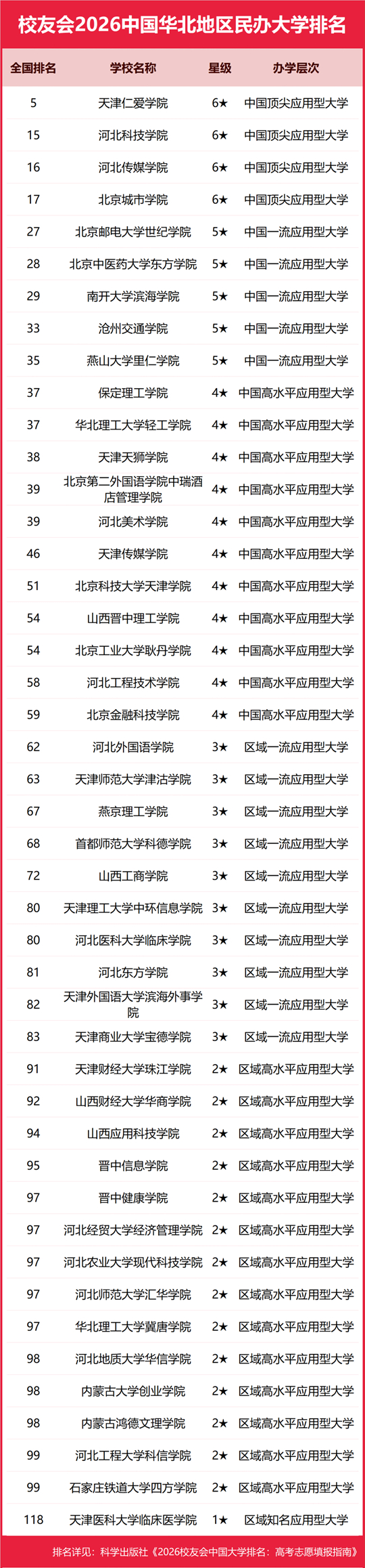 | 校友会2026中国华北地区大学排名,北京大学、天津仁爱学院、河北科技工程职业技术大学、天津轻工职业技术学院第一 |