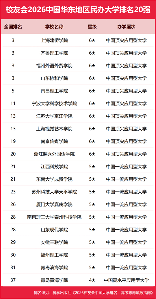 上海建桥学院、齐鲁理工学院、福州外语外贸学院、山东协和学院2026中国华东地区民办大学排名并列第一,南京传媒学院跻身前10强