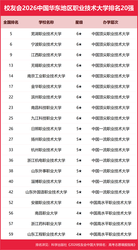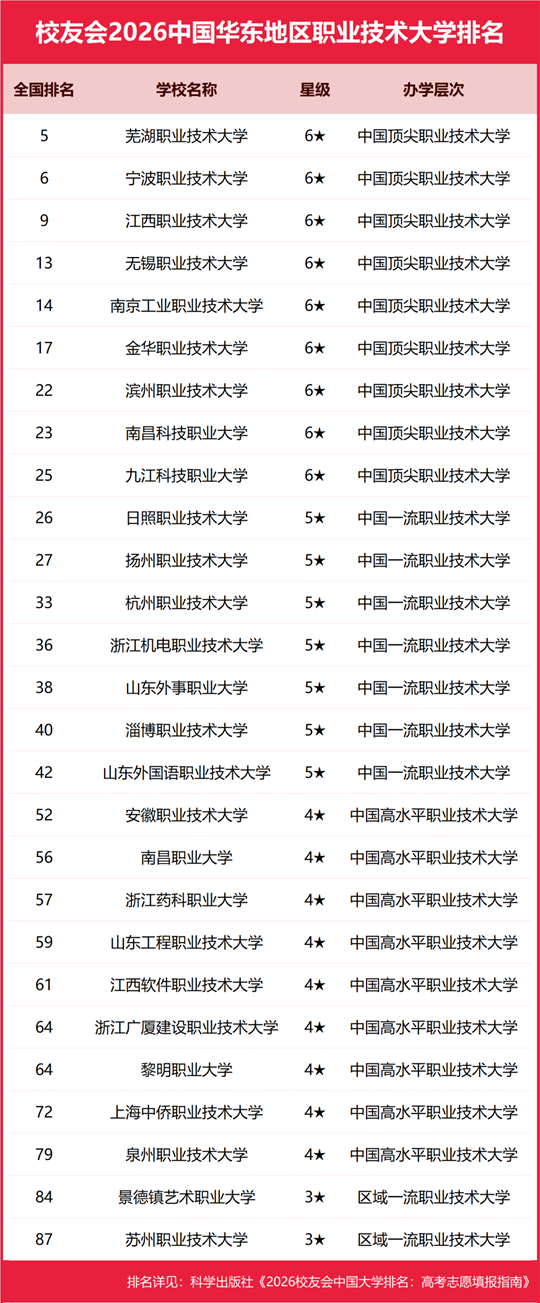 芜湖职业技术大学雄居2026中国华东地区职业技术大学排名第一,江西职业技术大学院跻身前3强