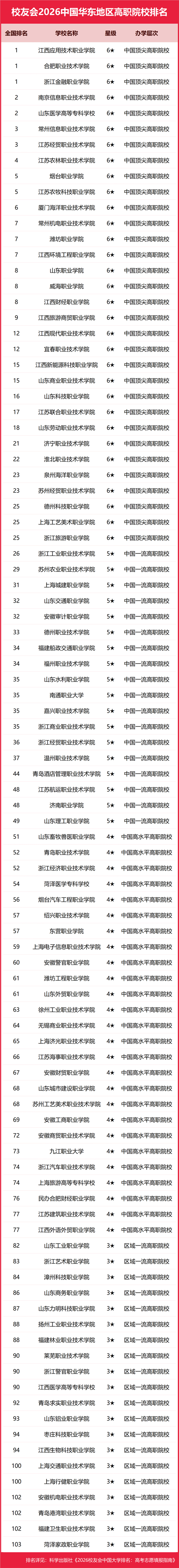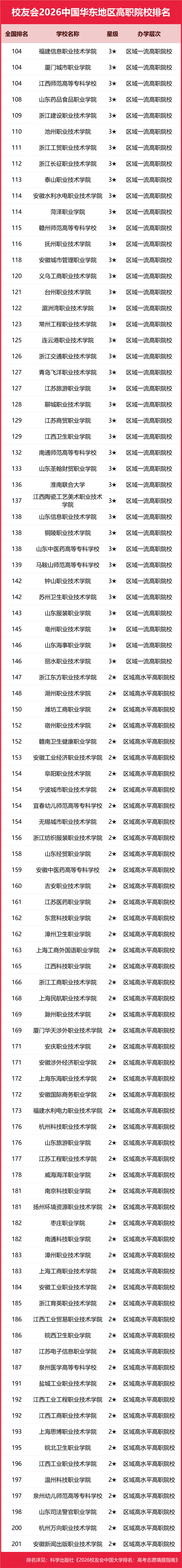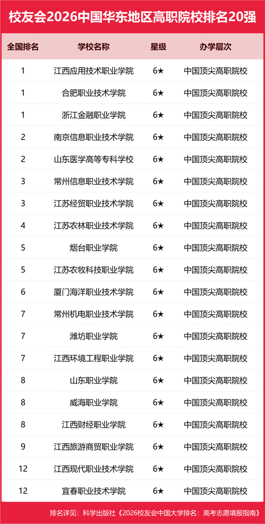 在校友会2026中国高职院校排名中,江西应用技术职业学院、合肥职业技术学院、浙江金融职业学院全国排名第1名,并列2026中国华东地区高职院校排名第一。名列前10强的其他高职院校为南京信息职业技术学院、山东医学高等专科学校、常州信息职业技术学院、江苏经贸职业技术学院、江苏农林职业技术学院、烟台职业学院、江苏农牧科技职业学院。