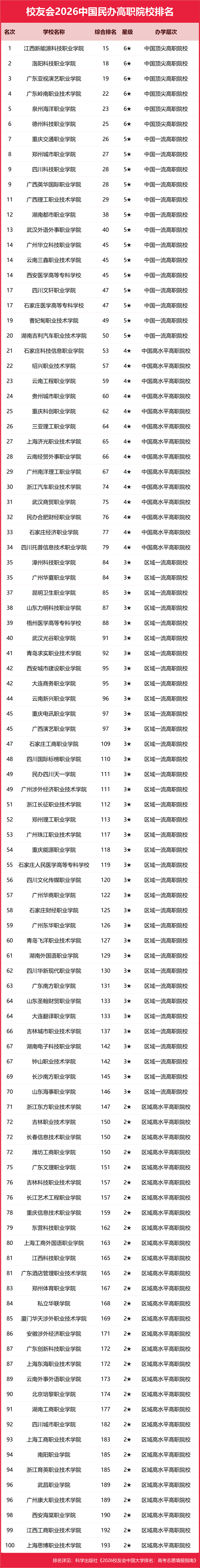 | 校友会2026中国民办高职院校排名,江西新能源科技职业学院、洛阳科技职业学院和广东亚视演艺职业学院前三 |