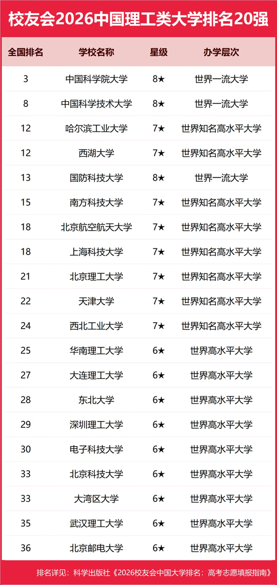 在最新校友会2026中国大学排名中,中国科学院大学全国排名第3名,雄居2026中国理工类大学排名第一。中国科学技术大学第2,哈尔滨工业大学、西湖大学并列第3。名列前10强的其他高校为国防科技大学、南方科技大学、北京航空航天大学、上海科技大学、北京理工大学、天津大学。