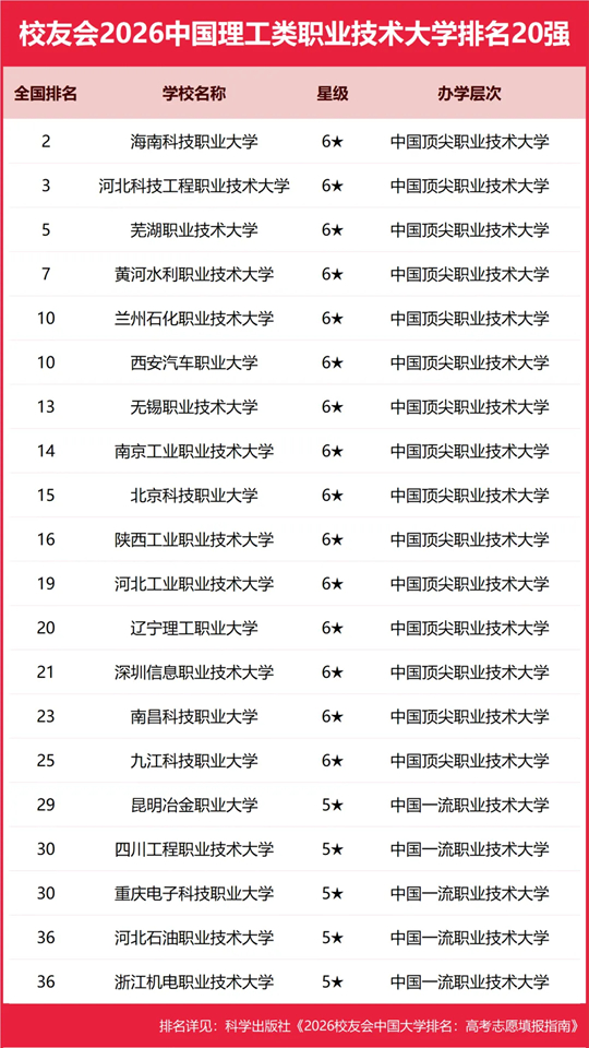 海南科技职业大学雄居2026中国理工类职业技术大学排名第一,山东经贸职业学院跻身前3强