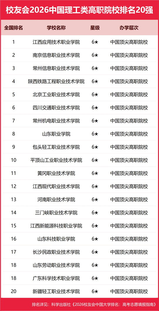 江西应用技术职业学院雄居2026中国理工类高职院校排名第一,南京信息职业技术学院跻身前3强