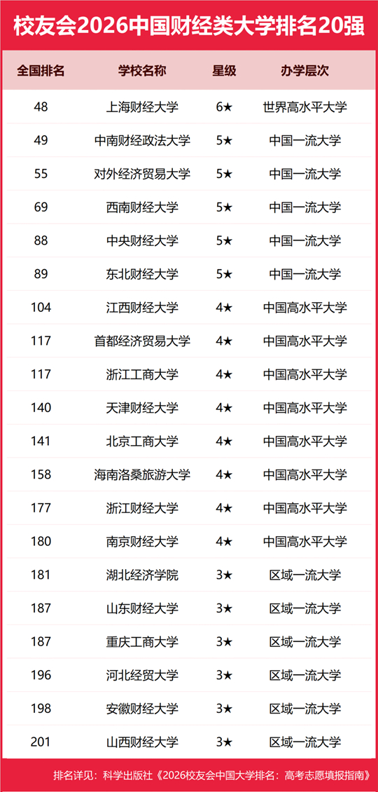 为了给2026年全国高考考生报考中国财经类高校提供参考指南,2026年1月12日,全国第三方大学评价机构艾瑞深校友会网(Cuaa.net)撰写完成、科学出版社即将出版的《2026校友会中国大学排名:高考志愿填报指南》最新发布校友会2026中国财经类大学排名。北京大学连续20年蝉联中国大学排名冠军,稳居霸主地位,问鼎2026中国大学排名榜首。清华大学第二,中国科学院大学和浙江大学并列第三,南开大学挺进全国前七,西湖大学、南方科技大学和上海科技大学挺进全国20强;福耀科技大学首次纳入中国大学排名,跻身全国50强。