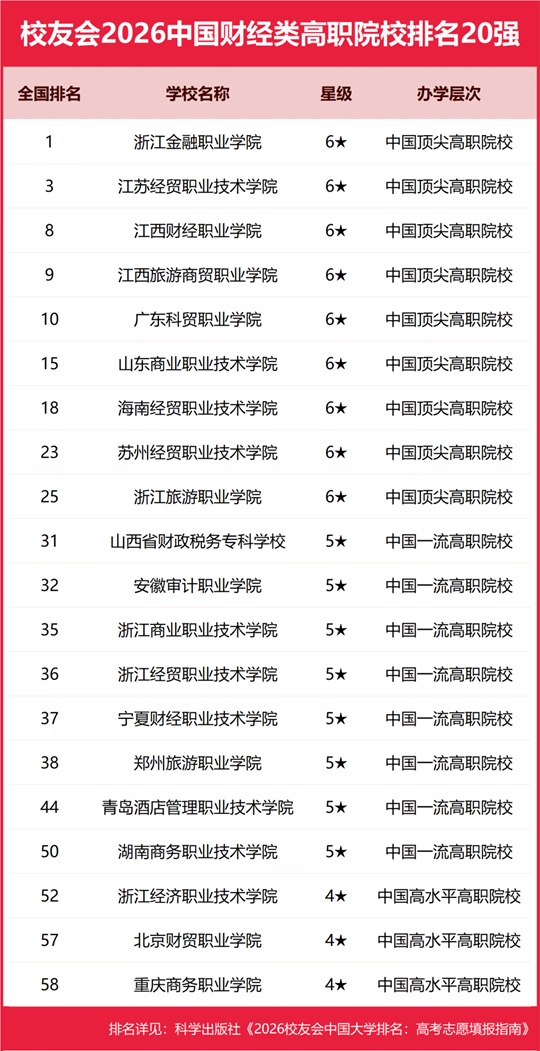浙江金融职业学院雄居2026中国财经类高职院校排名第一,山东商业职业技术学院跻身前10强