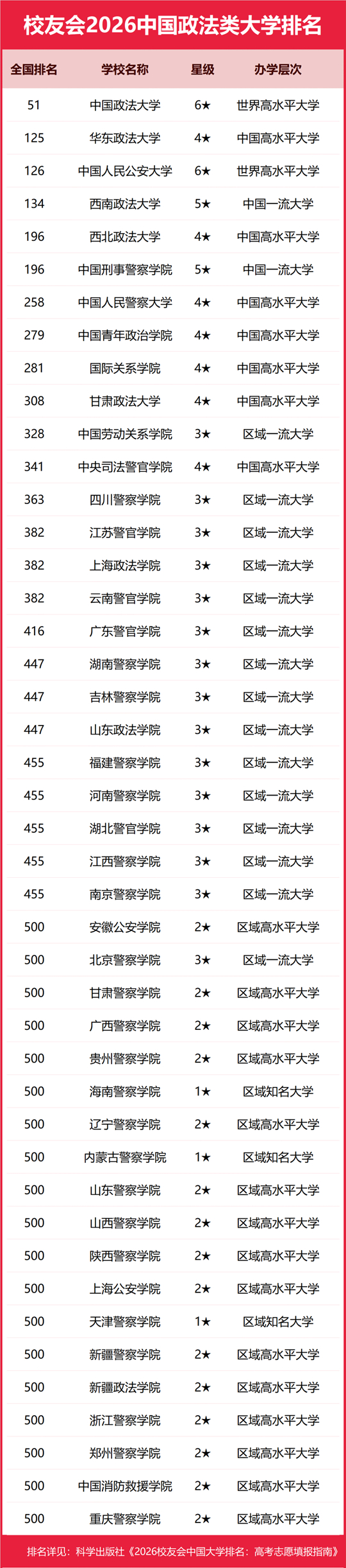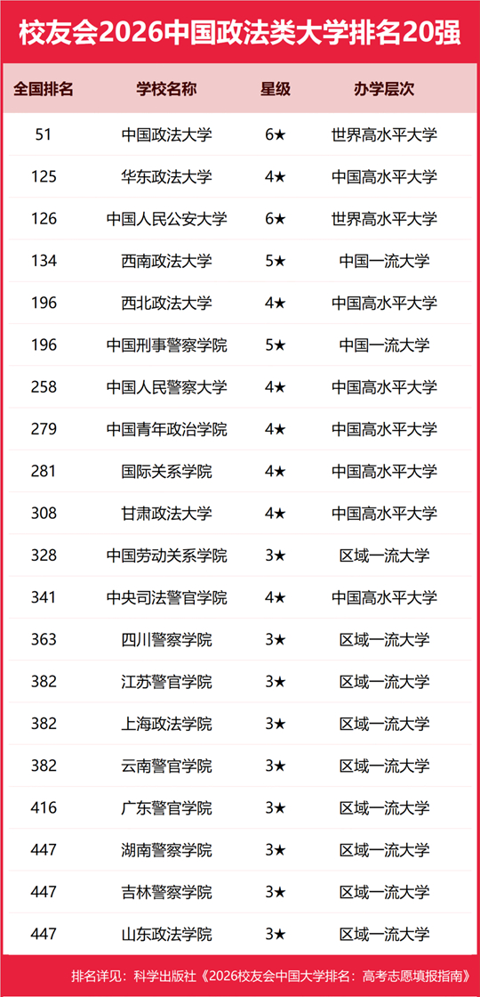 | 校友会2026中国政法类大学排名,中国政法大学、河北政法职业学院第一 |