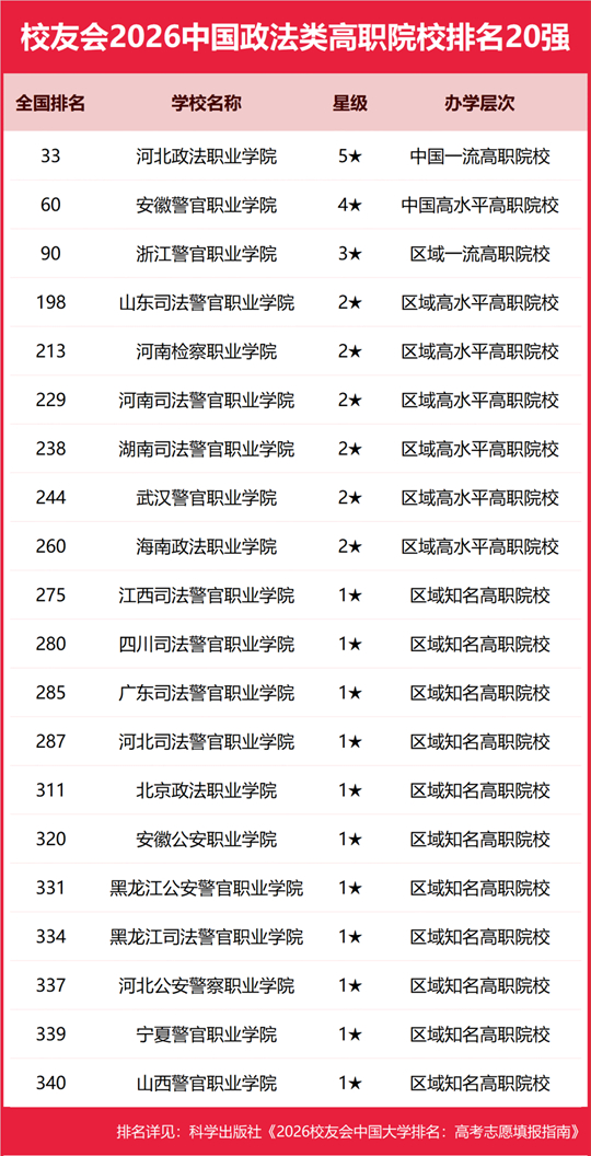 河北政法职业学院雄居2026中国政法类高职院校排名第一,浙江警官职业学院跻身前3强