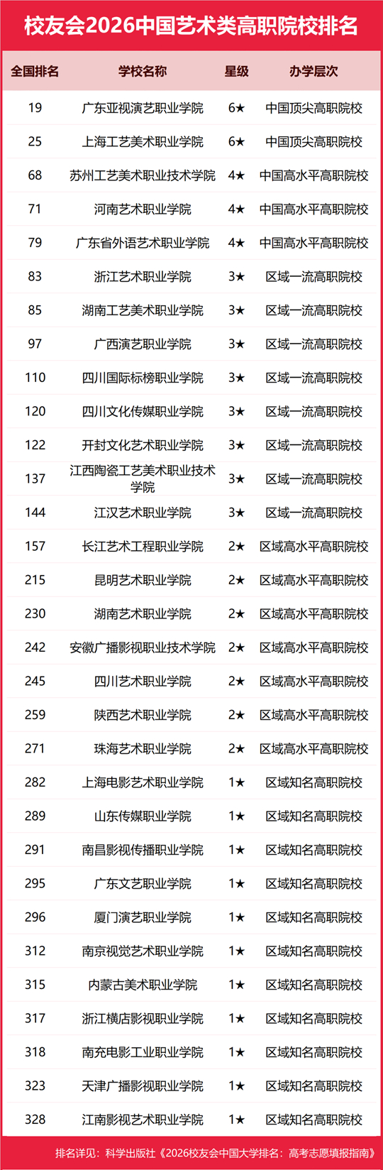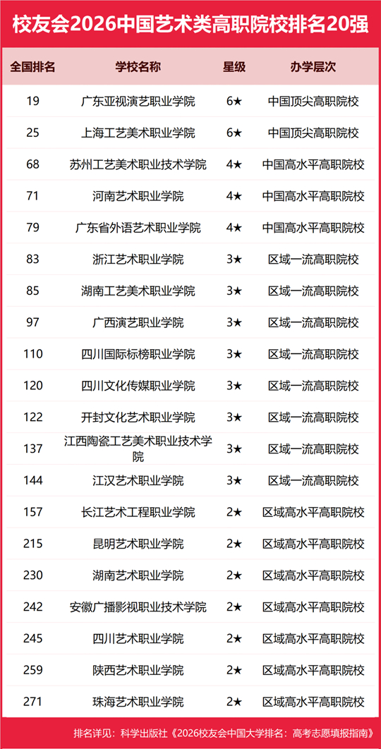 广东亚视演艺职业学院雄居2026中国艺术类高职院校排名第一,上海工艺美术职业学院跻身前3强