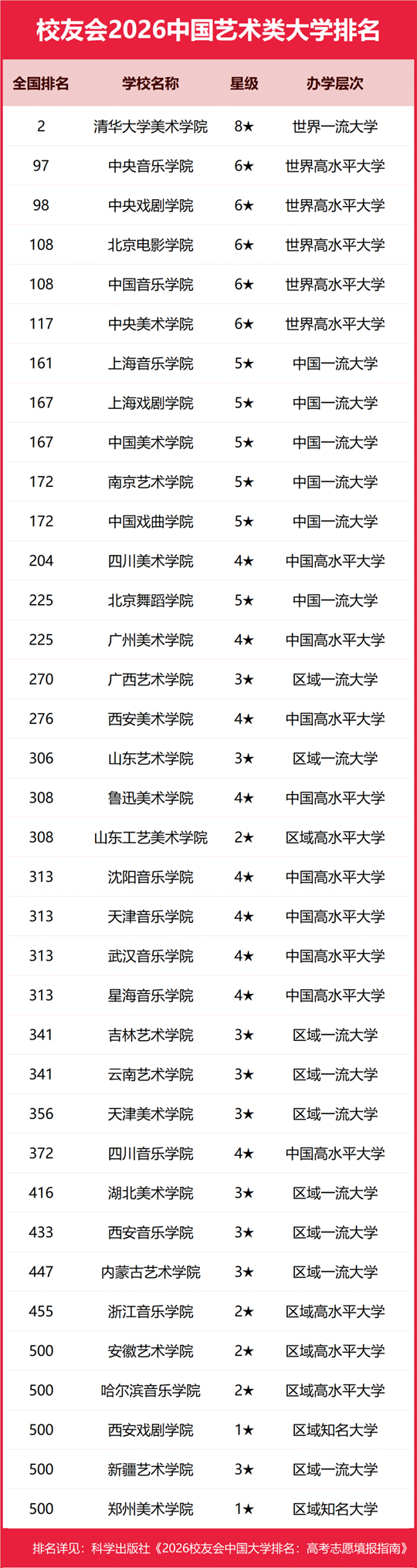 在最新校友会2026中国大学排名中,清华大学美术学院全国排名第2名,雄居2026中国艺术类大学排名第一。中央音乐学院第2,中央戏剧学院第3。名列前10强的其他高校为北京电影学院、中国音乐学院、中央美术学院、上海音乐学院、上海戏剧学院、中国美术学院、南京艺术学院、中国戏曲学院。