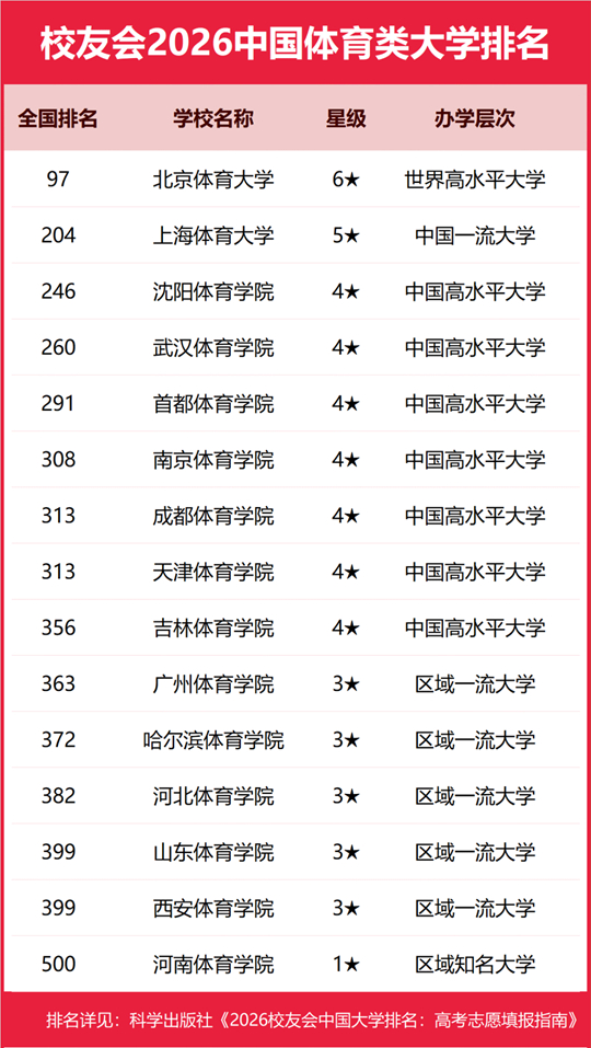| 校友会2026中国体育类大学排名,北京体育大学、武汉体育学院体育科技学院、郑州体育职业学院第一 |