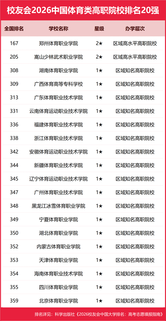 郑州体育职业学院雄居2026中国体育类高职院校排名第一,湖南体育职业学院跻身前3强