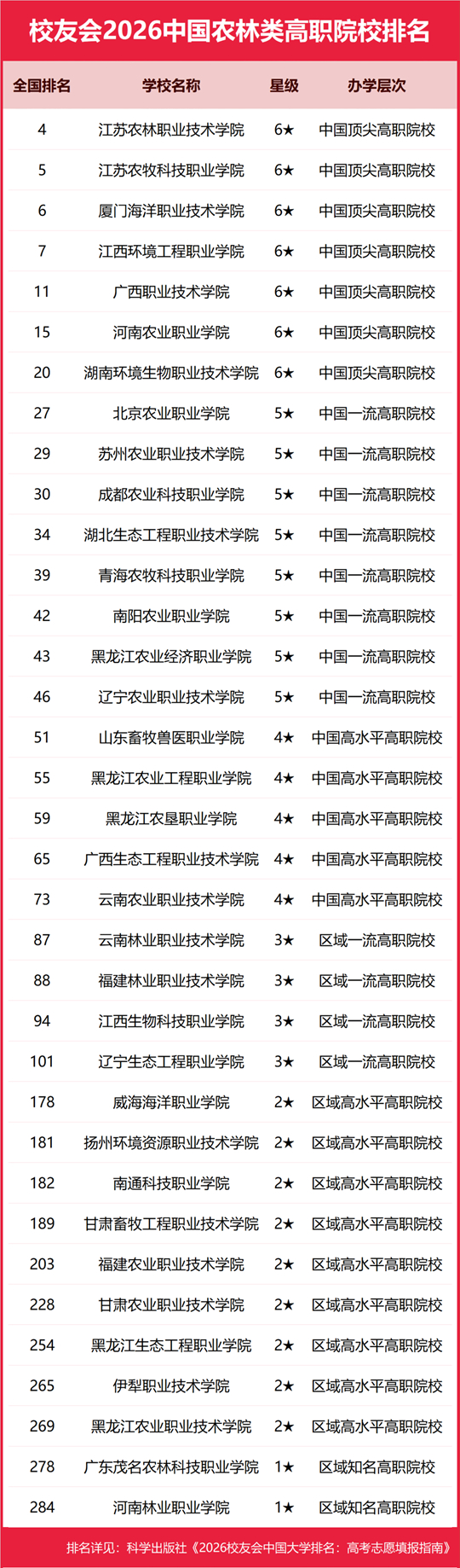 | 校友会2026中国农林类大学排名,中国农业大学、华南农业大学珠江学院、新疆农业职业技术大学、江苏农林职业技术学院第一 |