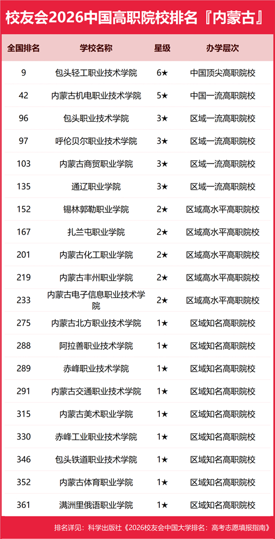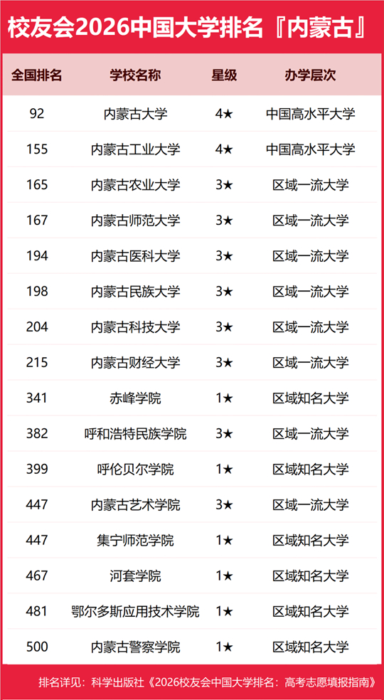 | 校友会2026内蒙古自治区大学排名,内蒙古大学、内蒙古大学创业学院、呼和浩特职业技术大学、包头轻工职业技术学院第一 |
