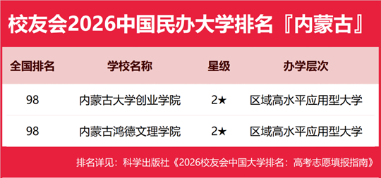 在校友会2026中国民办大学排名中,内蒙古大学创业学院、内蒙古鸿德文理学院并列全国排名第98名。