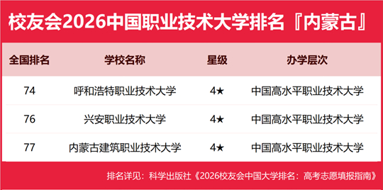 呼和浩特职业技术大学雄居2026内蒙古自治区职业技术大学排名第一,兴安职业技术大学院跻身前3强