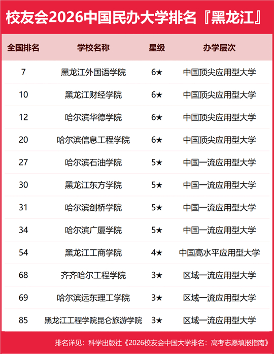 榜单显示,哈尔滨工业大学问鼎校友会2026黑龙江省大学排名首位,黑龙江外国语学院位列2026黑龙江省民办大学排名第一,哈尔滨职业技术大学位居2026黑龙江省职业技术大学排名榜首,黑龙江职业学院问鼎2026黑龙江省高职院校排名冠军。