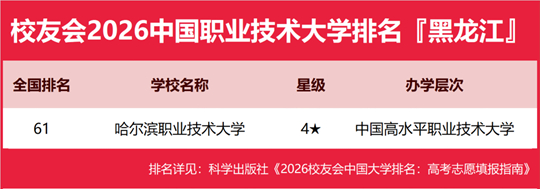 在校友会2026中国职业技术大学排名中,哈尔滨职业技术大学全国排名第61名,雄居2026黑龙江省职业技术大学排名第一。