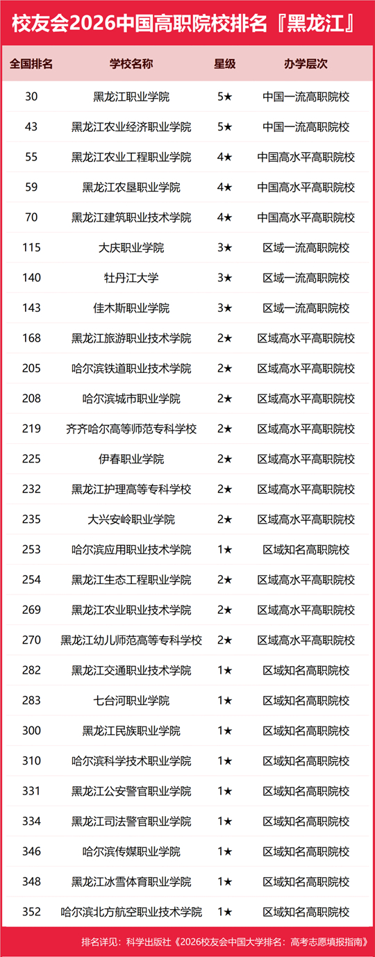 黑龙江职业学院雄居2026黑龙江省高职院校排名第一,黑龙江农业经济职业学院跻身前3强