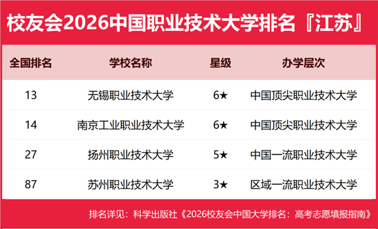 | 校友会2026江苏省大学排名,南京大学、江苏大学京江学院、无锡职业技术大学、南京信息职业技术学院第一 |