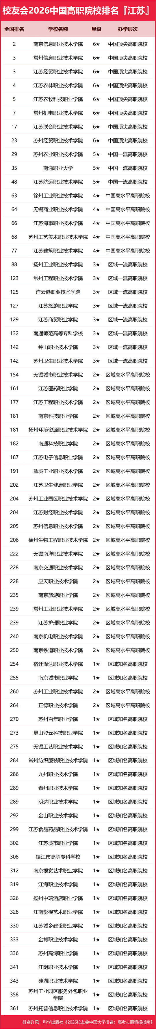 南京信息职业技术学院雄居2026江苏省高职院校排名第一,江苏经贸职业技术学院跻身前3强