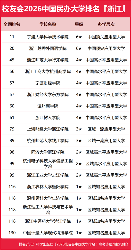 宁波大学科学技术学院雄居2026浙江省民办大学排名第一,浙江财经大学东方学院跻身前10强
