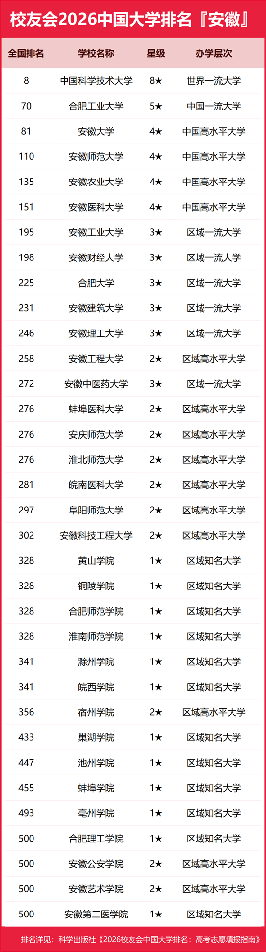 | 校友会2026安徽省大学排名,中国科学技术大学、安徽三联学院、芜湖职业技术大学、合肥职业技术学院第一 |