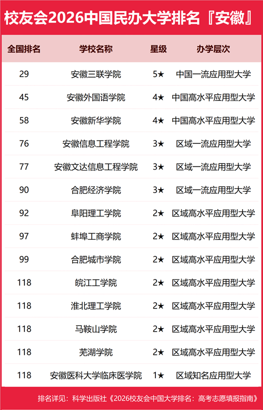 安徽三联学院雄居2026安徽省民办大学排名第一,安徽信息工程学院跻身前10强