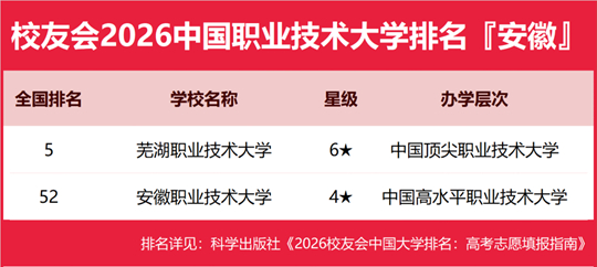 在校友会2026中国职业技术大学排名中,芜湖职业技术大学全国排名第5名,雄居2026安徽省职业技术大学排名第一。安徽职业技术大学列第2。