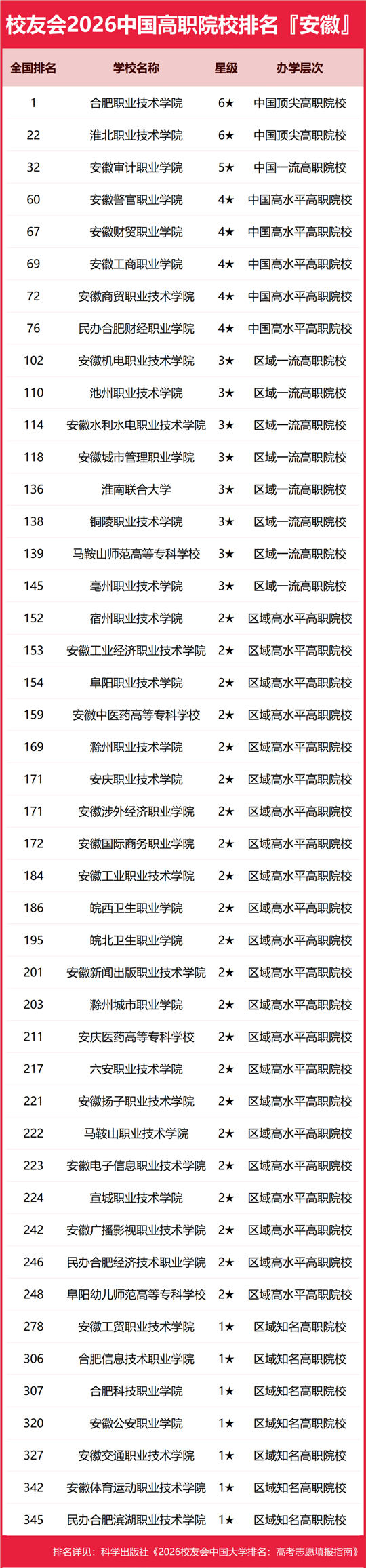 合肥职业技术学院雄居2026安徽省高职院校排名第一,安徽审计职业学院跻身前3强
