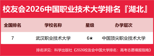在校友会2026中国职业技术大学排名中,武汉职业技术大学全国排名第7名,雄居2026湖北省职业技术大学排名第一。