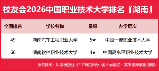 在校友会2026中国职业技术大学排名中,湖南汽车工程职业大学全国排名第49名,雄居2026湖南省职业技术大学排名第一。湖南软件职业技术大学列第2。