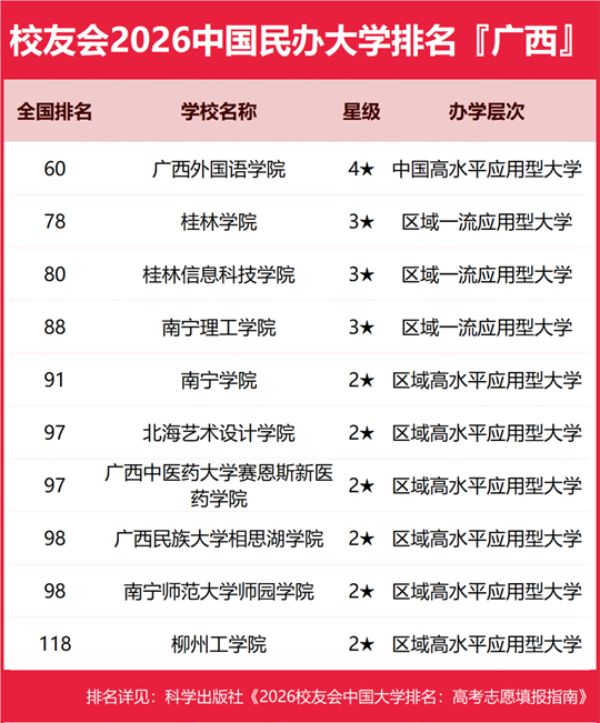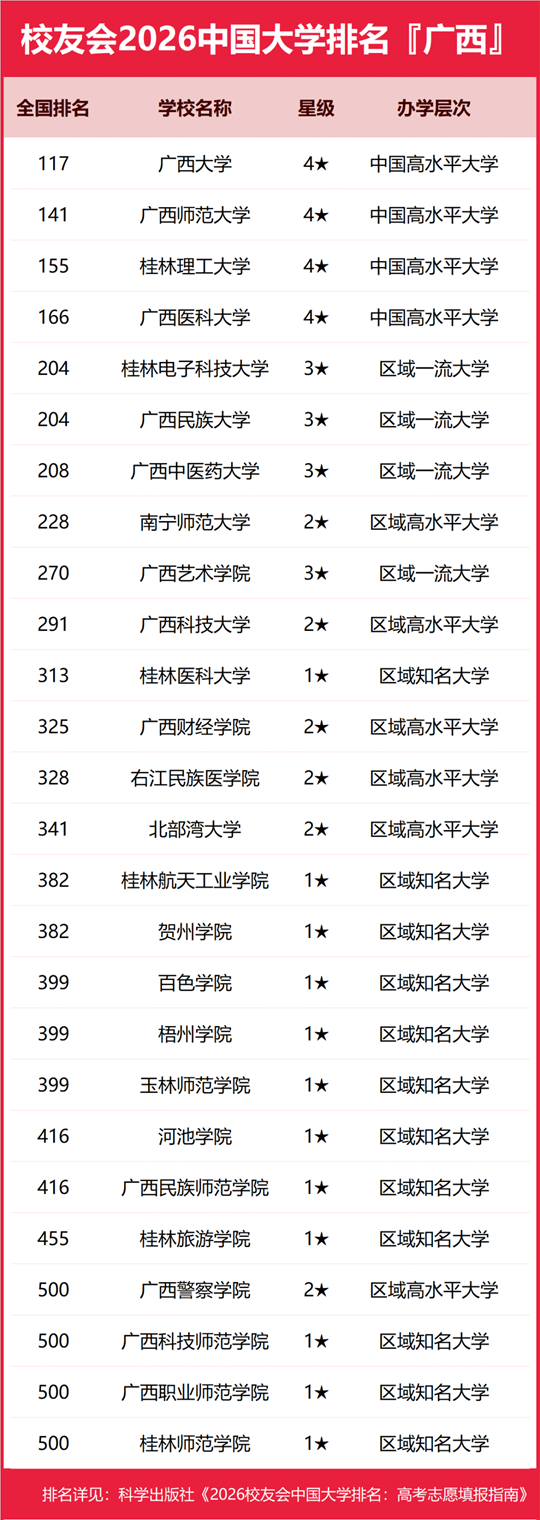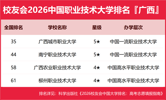 | 校友会2026广西壮族自治区大学排名,广西大学、广西外国语学院、广西城市职业大学、广西职业技术学院第一 |