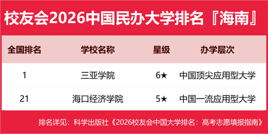 在校友会2026中国民办大学排名中,三亚学院全国排名第1名,雄居2026海南省民办大学排名第一。海口经济学院第2。
