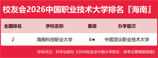 在校友会2026中国职业技术大学排名中,海南科技职业大学全国排名第2名。